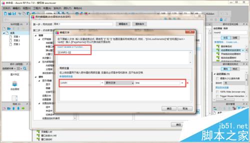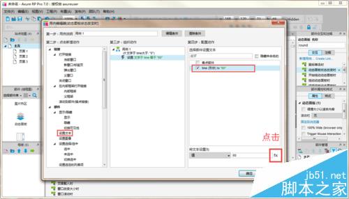 7、编辑动作,点击FX,跳转到编辑文字页面,按照图中添加,发现截图不清晰,下面吧设置写一下,添加局部变量,LVAR1=部件文字 time,变量计算[[LVAR1-1]]