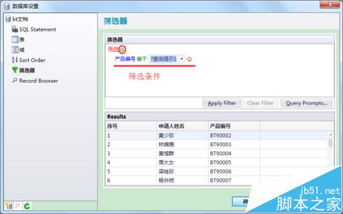 4、选择条件“而且”,单击符号加,弹出一行查询条件,设置查询数据所在的数据字段及查询条件。完成筛选条件的设置,以便快速查询指定数据进行打印。单击确定即可。