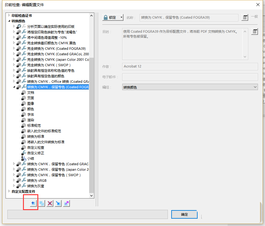 1、创建自定义修正配置文件:在“印前检查”中,任选一项,点击右侧“编辑”。并在弹出界面点击左下角按钮新建配置文件。