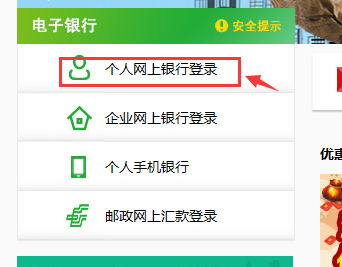 2、进入中国邮政储蓄银行官网,点击页面左侧上方的“个人网上银行登录”红色区域;