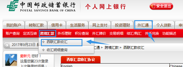 中国邮政储蓄银行网上银行西联汇款收汇如何操作.