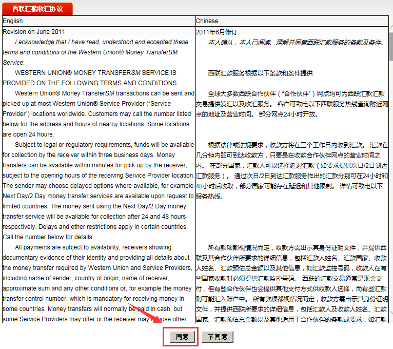 阅读西联汇款收汇协议,拉动滚动轴可浏览协议所有内容,并点击“同意”按钮,进入西联收汇页面;若点击“不同意”按钮,则返回网银登录首页;