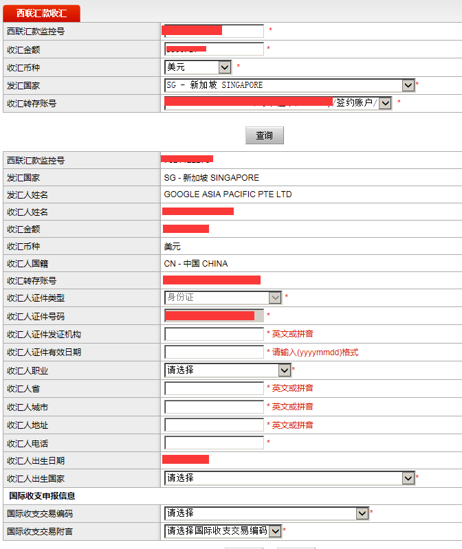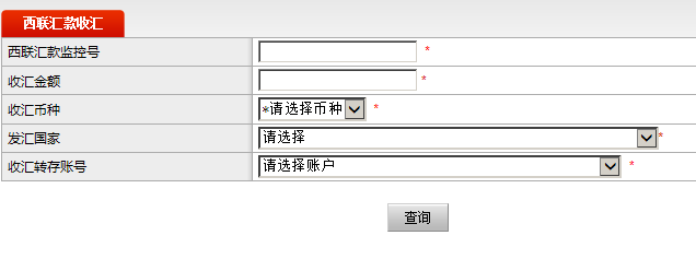 进入西联收汇页面,输入“西联汇款监控号”、“收汇金额”并选择相应的“收汇币种”、“发汇国家”以及“收汇转存账号”后,点击“查询”按钮;
