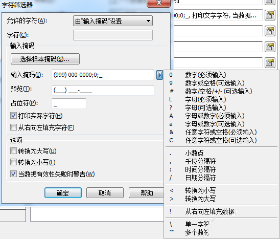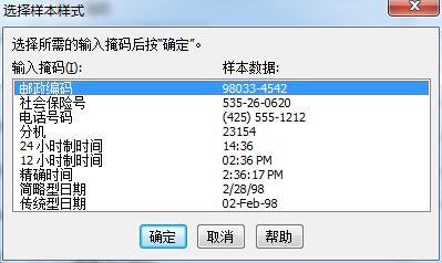 选择样本掩码: 打开“选择样本掩码”对话框,使用该对话框可选择多个已准备的样本输入掩码中的一个。 当“允许的字符”选项设置为“由输入掩码设置”时可用。