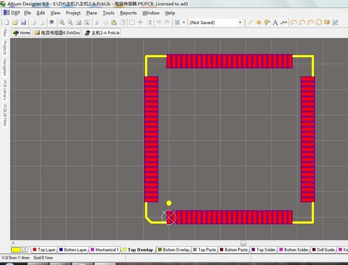 8、接下来我要画边框了,也就是元件的外围,我们按下GG,改成10MIL,然后切换左下角的层为Top Overlay丝印层,然后在工具栏选择Place Line放置线。