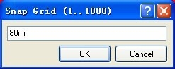 7、现在我们把这两个焊盘按长度为80MIL来放置,首先按下快捷键GG,输入法在EN的时候才有效,注意是连续2次按下GG,然后在对话框里输入80MIL,单击OK,我们再按着标号为2的焊盘不松手左右移动,大家看左下角的坐标,X=80,Y=0上,因为1脚是在X=0,Y=0的原点上,所以1脚与2脚的距离 为80MIL。
