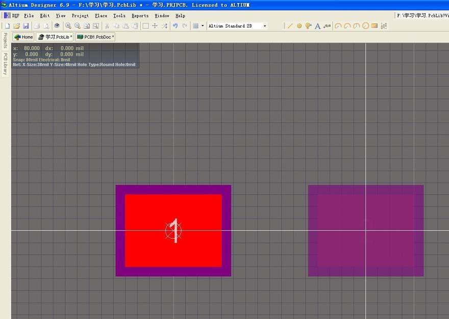 5、然后我们放置2个焊盘,然后我们要知道0805的意思是长度为:80MIL,宽度为50MIL的一个元件大小,焊盘的大小我们可以根据资料得知,我们这里的焊盘大小设置成X=30MIL,Y=40MIL。