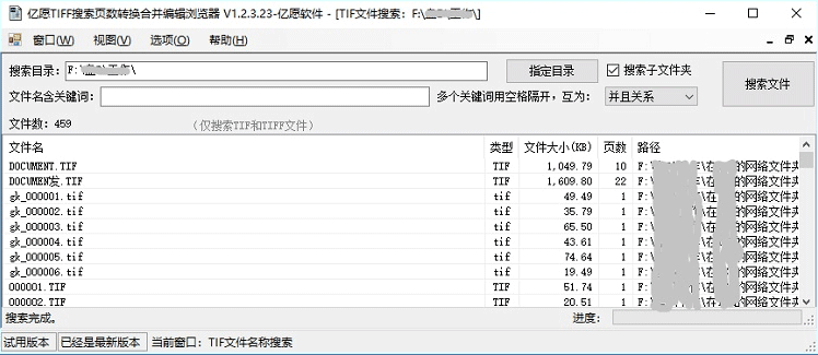 3、点击菜单“窗口”,点击“新建文件搜索窗口”,弹出TIF文件搜索窗口,指定目录和搜索条件,点击“搜索文件”按钮,列表中显示搜索结果,文件大小,页数和所在位置,双击选中的文件,可以打开浏览文件;