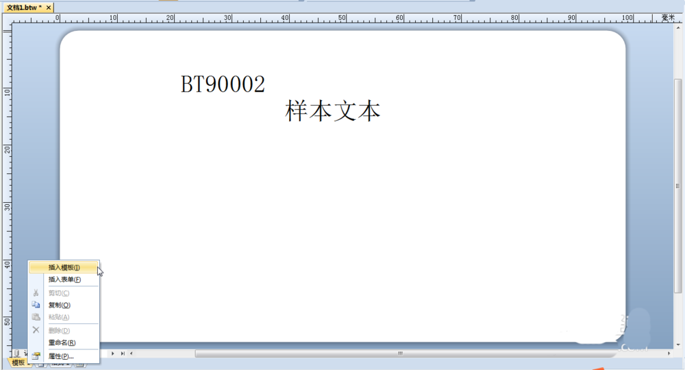 在“模板设计区域”的底部,单击“模板1”,鼠标右键以打开上下文菜单,从上下文菜单中选择“插入模板”,默认名为“模板2”的BarTender新模板就添加好了。以同样的方式,你可以随意插入多个模板。