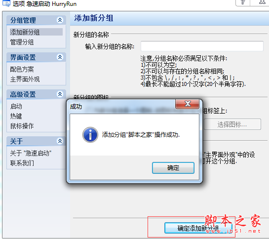 5、点击确定建立新分组,提示添加分组脚本之家操作成功