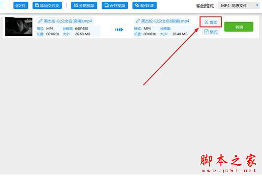 2、在迅捷视频转换器内添加完视频之后,就可以点击视频文件右侧的“剪切”功能选项进行剪辑了,如下图所示: