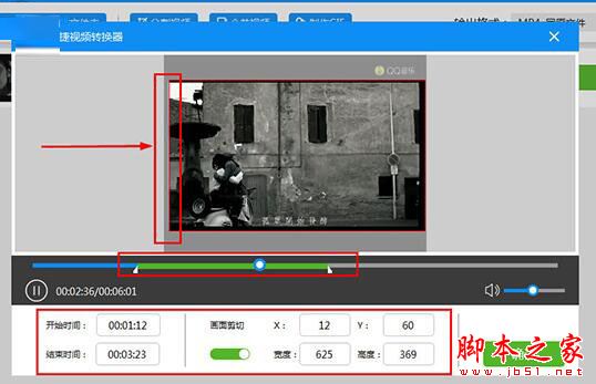 3、在弹出剪辑视频的界面之后,用户可以在进度条上进行调整,在进度条上左边的时间点为开始时间,右边的时间点为结束时间,下方的开始、结束时间更有利于进行调整,如果你不知道准确的时间,也可以边播放视频边调整所选取的时间段;当你的视频或MV中有不合适的地方,想要进行删除,这时候只需要打开其中的“画面剪切”功能,根据自己的需要在画面中调整红框,红框内所保留的画面就是最终剪辑出来的视频画面,上面调整完之后你还可以在下方调整宽度、高度,最后只需要点击“确认”选项即可,如下图所示: