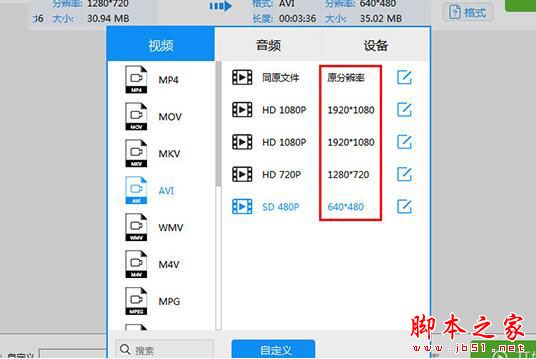 2、小编在这里选择单独设置视频文件,点击之后将会弹出输出格式的选择,如果你想要使压缩后的视频在电脑中播放,则默认选择MP4、AVI等文件,如果你想要将压缩后的视频在不同的设备上播放,则可以在设备中选择不同的输出格式,每一个格式中都有不同的分辨率,根据自己的压缩需求选择不同的分辨率,分辨率越小压缩的视频文件就越小,如下图所示: