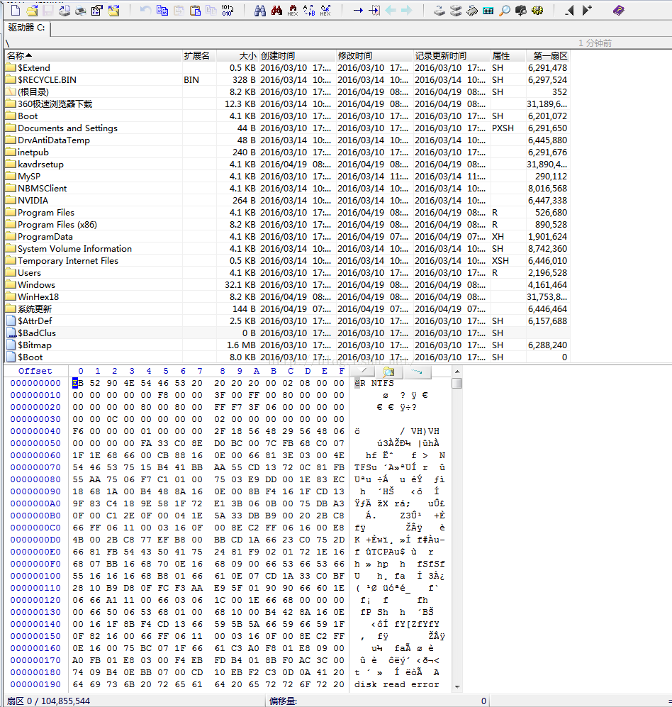 上方是目录和文件情况;下边是打开磁盘的16进制数值;