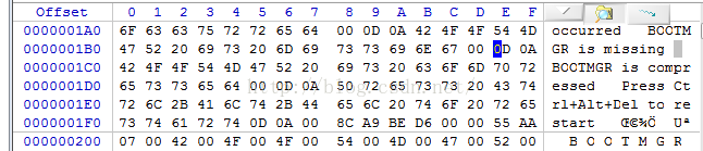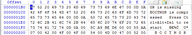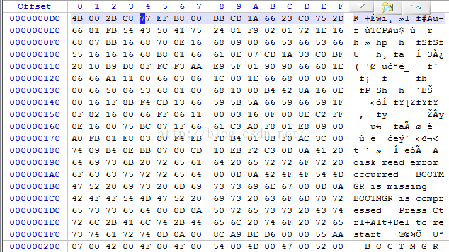 找到偏移00000200,如下图,每个扇区结束有一个横线标志;偏移从00000000开始,那么第二个扇区的起始偏移是00000200;看下下图,Offset列值为000001F0所对应行的最后2个字节,为55 AA,正是MBR的结束标志;这样就找到了MBR所在区域;