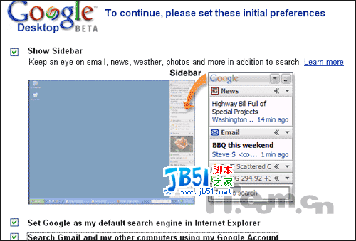 一、安装过程要注意 安装过程中,会弹出提示,需要要先设置有些首选参数,比如“show sidebar”(是否显示侧边栏),是否将google设置为默认的搜索引擎,是否搜索Gmail中的文件等: