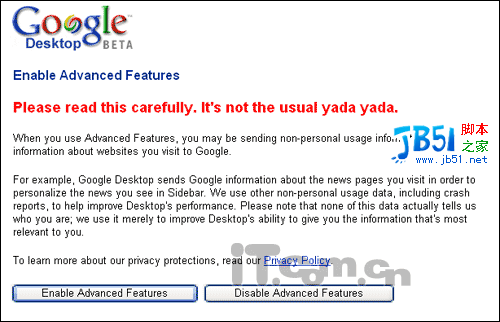 图1 接下来会提示是否启用高级设置,当你启用高级设置时,该软件会自动发送一些你使用的非个人隐私信息以及你通过GOOGLE访问的网站的相关信息。比如你使用google 桌面搜索后侧边栏中出现的信息,还包括该软件出错的一些信息。启用高级设置的目的是为了获取更多的相关信息,从而提高桌面搜索的能力。这里我们选择“Enable Advanced Features”。