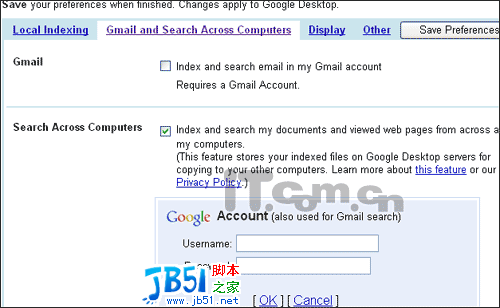 在“Search Across Computers”后勾选“Index and search my documents and viewed web pages from across all my computers.”即可进行远程桌面搜索,需要注意的是:使用该功能必须需要你拥有Google Account(GOOGLE帐户 ),你可以使用GMAIL帐户,也可以重新注册google帐户。