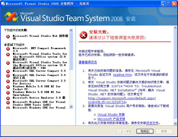 安装VS2008ProEdition90DayTrialCHSX1435983 在"Visual Studio Web 创作组件"中安装老是失败,打开