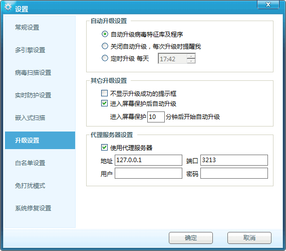 设置完成后可前往客户端电脑上的360杀毒进行验证,打开360杀毒的“设置”对话框,并选择“升级设置”,即可看到代理服务器设置: