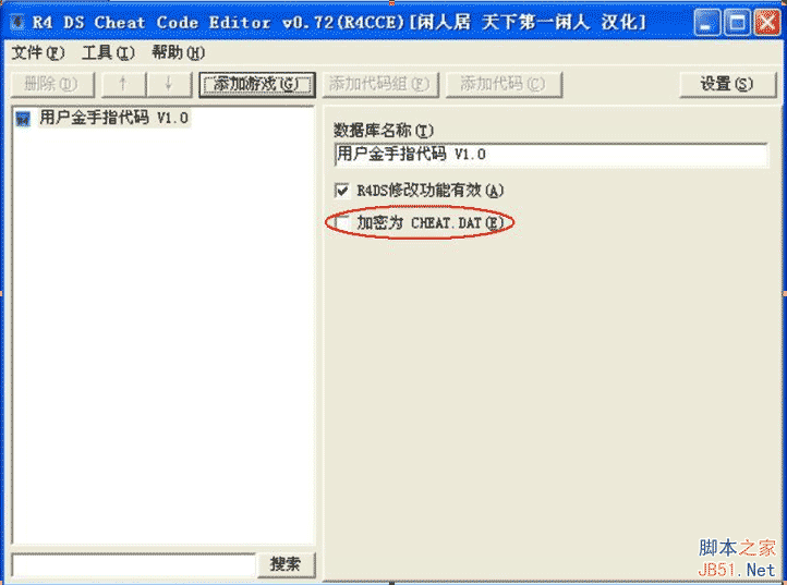 选中“加密为CHEAT.DAT”将用官方加密方式加密金手指数据库. 如下图所示: