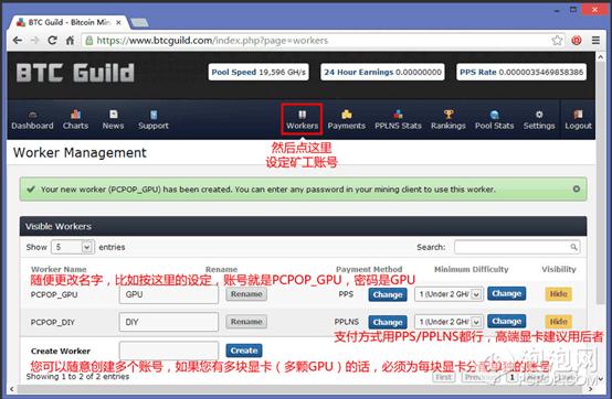 然后就是最重要的矿工账号设置了,矿工显然指的就是CPU或者GPU,您需要为每一个CPU或GPU设定一个账号,假设您有两块HD7990,就需要为4颗GPU设定4个不同的账号