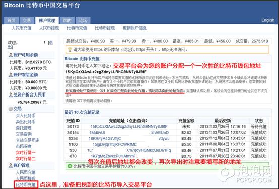 点击比特币中国交易平台的比特币充值功能,系统会为您提供一个一次性的比特币数字钱包地址,这个地址只能被充值一次(这是该平台出于安全性的考虑),充值成功后作废,然后系统会给您提供另一个地址,记得每充值一次都要及时更新钱包地址,否则会导致充值失败或丢失