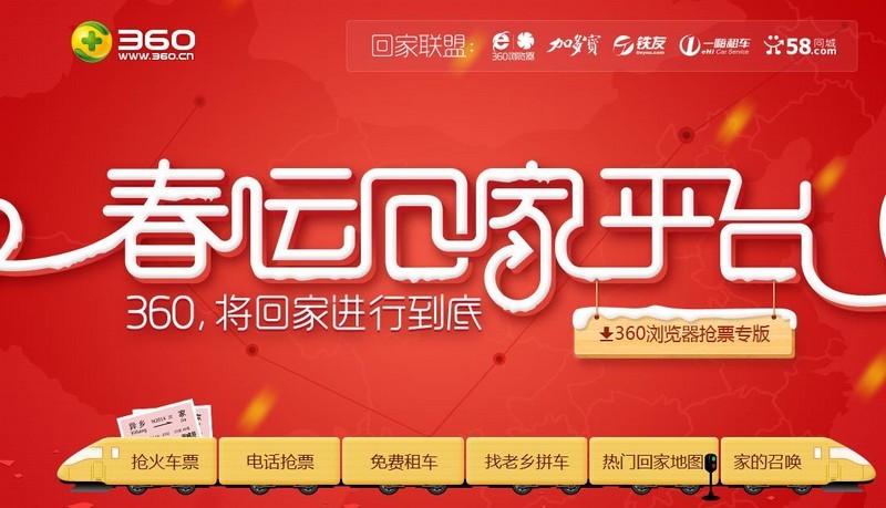 360方面和猎豹差不多,抢票专版和代购车票服务,人家叫“二代抢票”平台,听着比猎豹厉害那么一点点,并且还有离线抢票功能,简直弱爆了!合作方为“铁友”。看到下图左上角的“回家联盟”了么!?够强大吧!