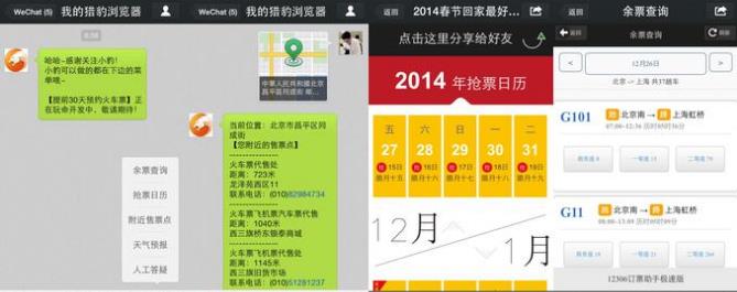 猎豹微信插件订票,添加微信服务号“我的猎豹浏览器”,就能通过自定义菜单去订票了!无需安装下载,直接云端订票,相关功能和PC和代购类似,这里就不多说了!