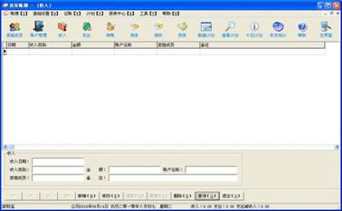 打开“家财宝”主界面如图2-2所示,上方为“家财宝”菜单区域和快捷按钮区域,中间位工作区,下方为状态区域。