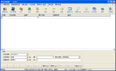 在图2-2选快捷按钮区域选“支出”按钮或选择“记账”菜单里“支出”命令即可打开“支出”记账窗口,如图2-4所示。