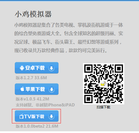 进入小鸡模拟器可免费下载小鸡模拟器TV版。打开官网后,点击【TV版下载】即可将小鸡模拟器TV版下载到电脑,随后手动安装到电视盒上即可。