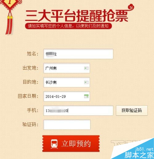找到填写预约信息的地方,填上你的姓名,出发地,目的地,回家日期,手机号码,点获取验证码,如果收不到验证码,可以多试几次。如下图