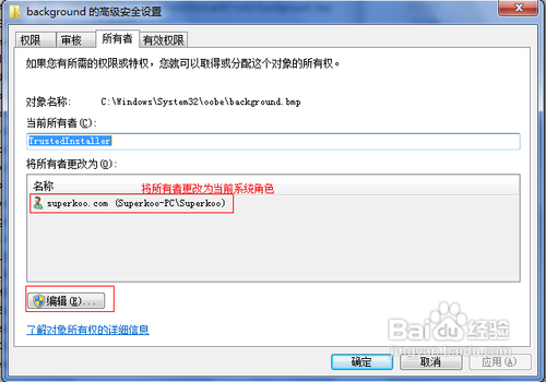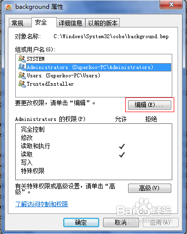 4、修改角色的控制权限,获得文件所有者权限后,就可以对文件赋予相应的控制权限了(此处设置Adminitrators为完全控制权限)。重新打开文件安全属性,点击编辑