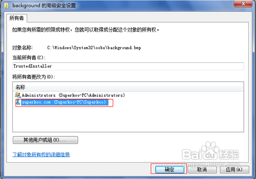 3、选择当前用户为所有者并确定,这样文件的所有者就变成了当前用户了。注意:需要重新打开文件属性才能生效。