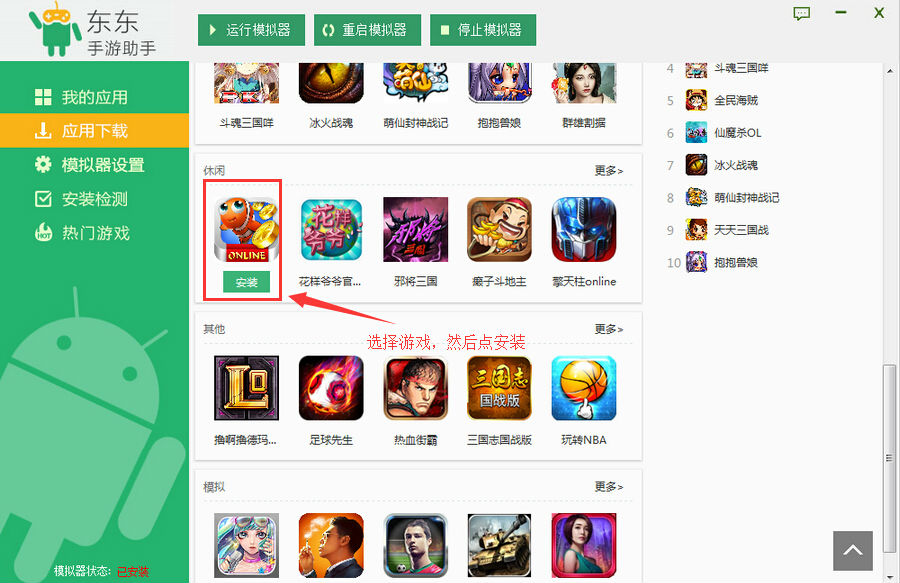 如果是要下载游戏的话,直接点左边应用下载,右边会呈现不错的资源供大家参考下载。小编以捕鱼达人为例。选择游戏直接点安装。