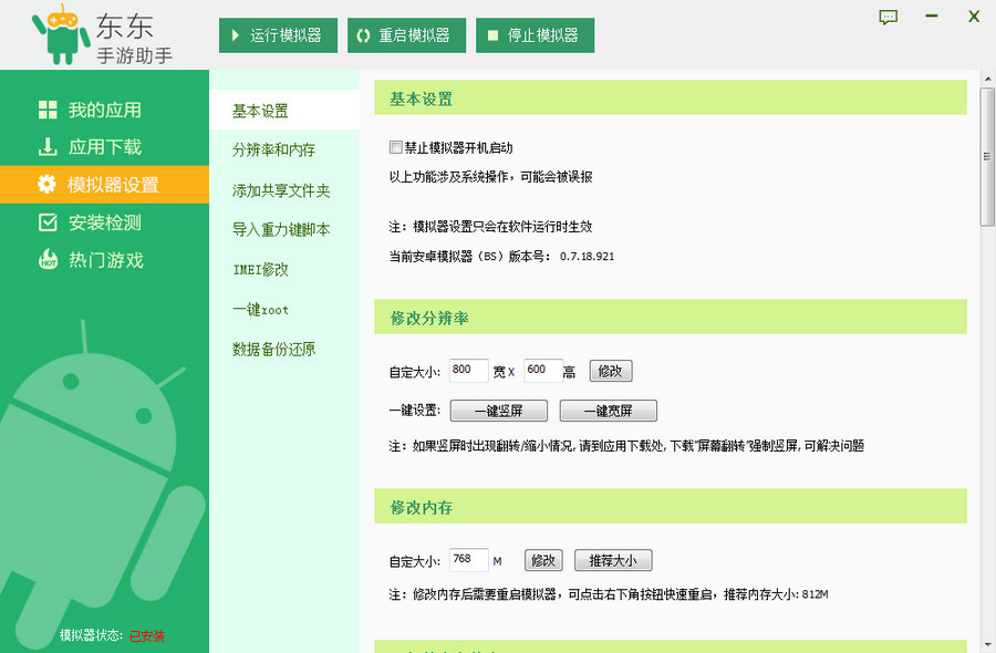 模拟器设置修改分辨率、添加共享文件夹、一键root、数据备份还原等操作。
