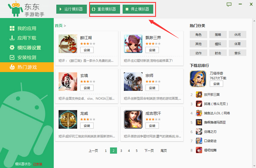 如果不想使用模拟器了还可以直接点停止模拟器或者重启模拟器。