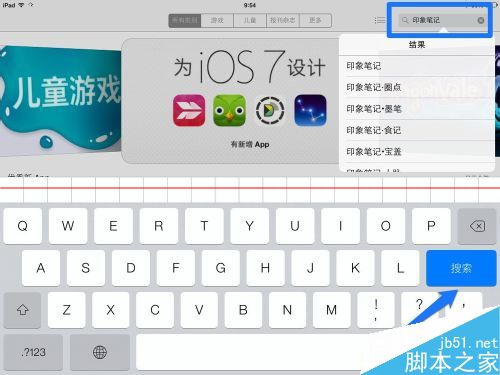 3、在搜索框中输入“印象笔记”关键字,再点击键盘上的“搜索”键,如图所示