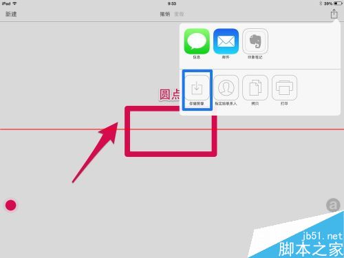 7、随后在弹出的分享菜单中,可以用信息,邮件,印象笔记等分享。这里以保存到 iPad 相册中为例,点击“存储图像”图标,如图所示