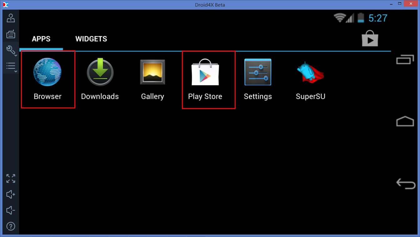 进入模拟器页面,点击浏览器按钮,可以浏览网页,也可以在网页上下载应用。您也可以直接点击Play store按钮,登录或者注册一个Google账号,即可直接下载游戏到Droid4X模拟器。
