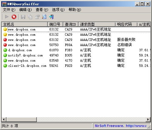 我使用的是一个名为DNSQuerySniffer的嗅探工具,该工具能够实时显示本地电脑的DNS查询记录,对于每一个DNS解析查询,显示以下信息:主机名,端口号,查询ID,请求类型,请求响应时间,响应代码等记录,并返回的DNS记录的内容。域名添加到Hosts文件中,DNSQuerySniffer就不会再检测到该域名的解析,然后继续运行Sniffer嗅探器和应用软件,一个一个找出所有的无效域名,然后手动将每个域名都添加到Hosts文件即可。