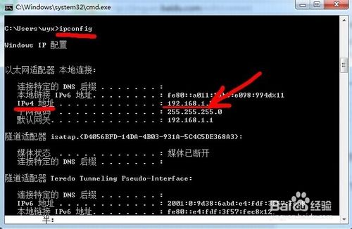 1、首先要知道两台电脑的ip地址。ip地址可以通过电脑开始菜单中的运行框,输入cmd 在弹出的对话框中输入 ipconfig来获得。分别记下两台电脑的ip地址。例如我的电脑A和电脑B的ip地址分别是192.168.1.50和192.168.1.62。