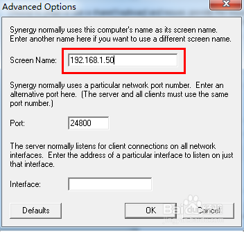4、在advance中,要填写电脑IP地址作为screen name。将之前获得的A电脑的ip地址填写到Screen name中。后两项不用改,点击ok。