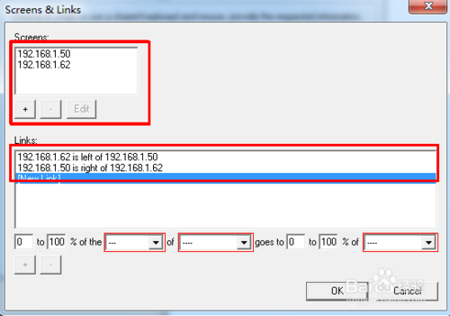 5、在主界面中,点击configure,进行配置。Screen name项点击+键填写A 和B 两台电脑的ip地址,并且在links中填写链接规则。规则是A is left of B 和 B is right of A.参照下图。点击OK