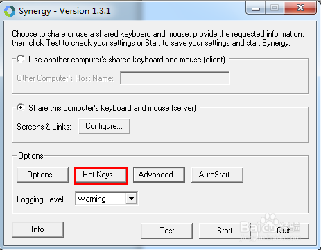6、点击hot keys进行快捷键的设置,点击+键进行添加快捷键(按住键盘的快捷键组合),对应的,在右边的对话框中添加快捷键对应的动作,是切换到A电脑还是切换到B电脑。到此,A电脑就设置完成了,点击start