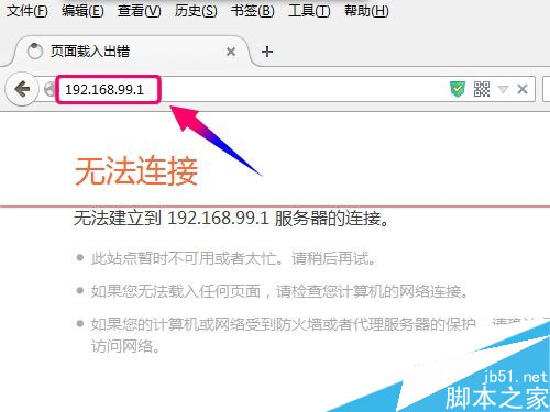 2、在电脑上打开浏览器,输入路由器默认的管理IP地址192.168.99.1,纳尼?为什么提示无法访问呢?出现此问题不多说是IP问题了