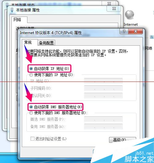 6、然后把IP和DNS更换为自动获取IP模式,点击确定保存设置退出