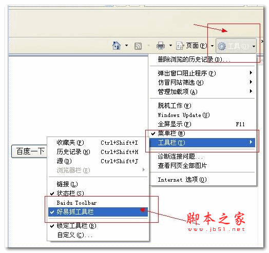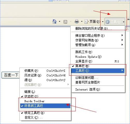 好易抓软件仅适用于ie浏览器好易抓是一个ie浏览器插件,安装之前请先关闭IE浏览器,安装完成以后如果打开IE没有看到好易抓,则在IE浏览器的菜单上依次选择查看->工具栏,然后将好易抓勾选上。