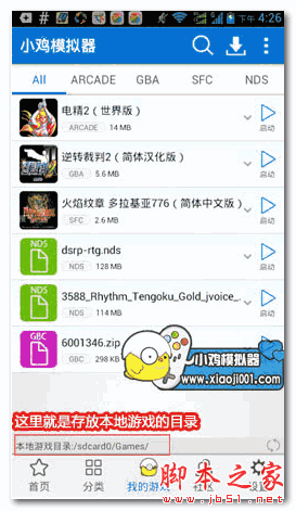 注意1:自传游戏的文件后缀必须符合该游戏对应模拟器所要求的格式,如nds模拟器仅支持.NDS和.ZIP后缀的文件,放其它后缀的文件进去就不能显示。
